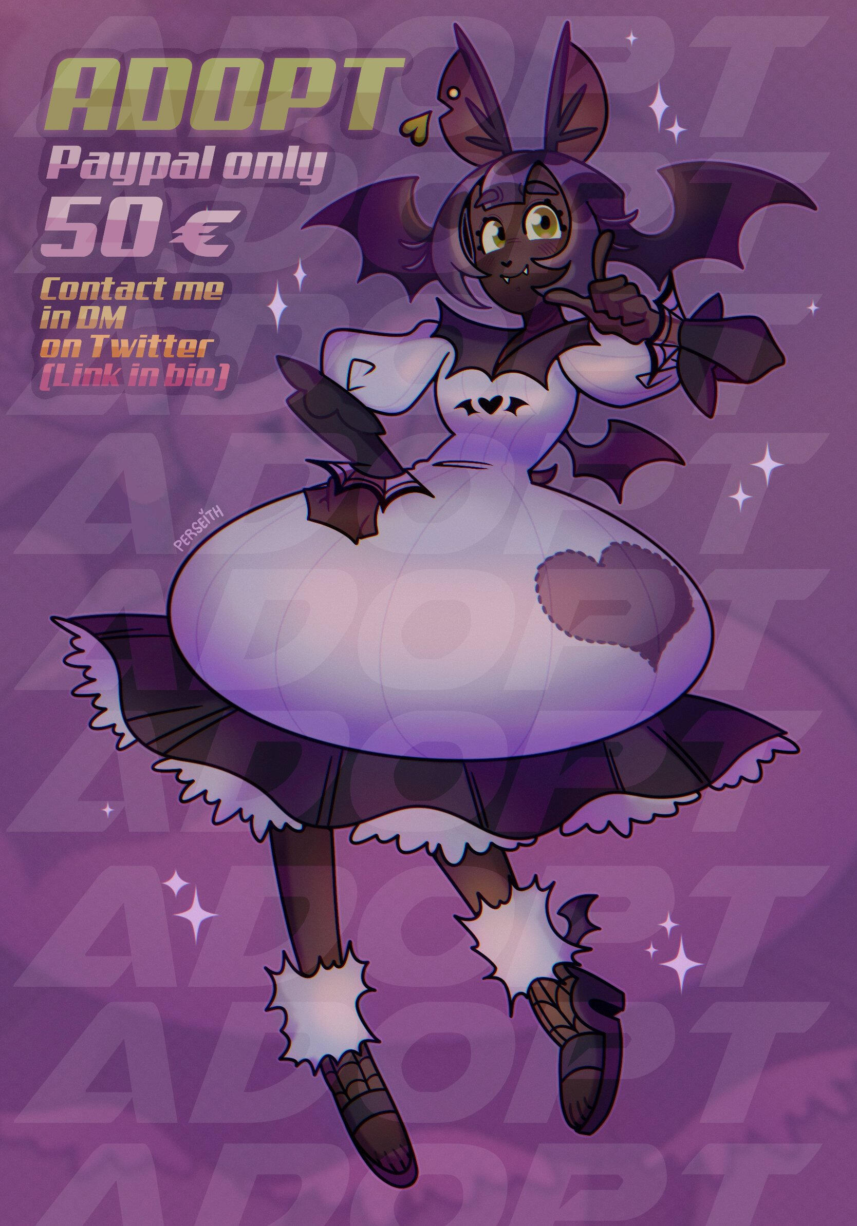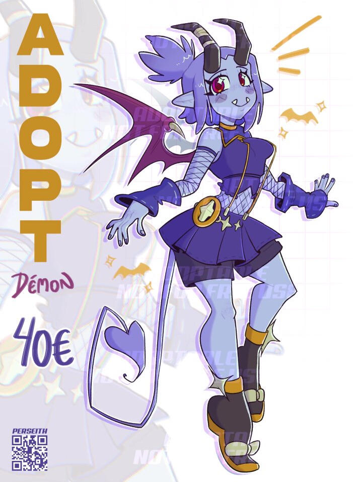 - Les adoptables acheté pour utilisation commerciale (exemple : TeePublic, Redbubble) entraineront des frais supplémentaires qui doivent être discutés.- Les adopts promotionnelles ou destinées aux réseaux sociaux des créateurs de contenu, pour du contenu monétisé (exemple, un programme de diffusion, une miniature de vidéo YouTube, des panneaux Twitch) utilisant mes adopts entraîneront un supplément de 100 % du prix final de l'adoptable.- Les adopts ne doivent pas être utilisées ou vendues en tant que NFT ni être utilisées dans une quelconque association avec l'IA.